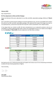 The company revealed this in a statement to customers on Monday titled, “Price adjustment on DStv and GOtv packages” and signed by the CEO John Ugbe.